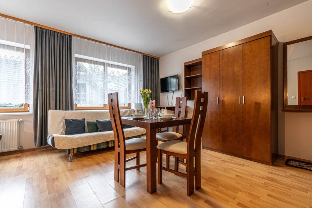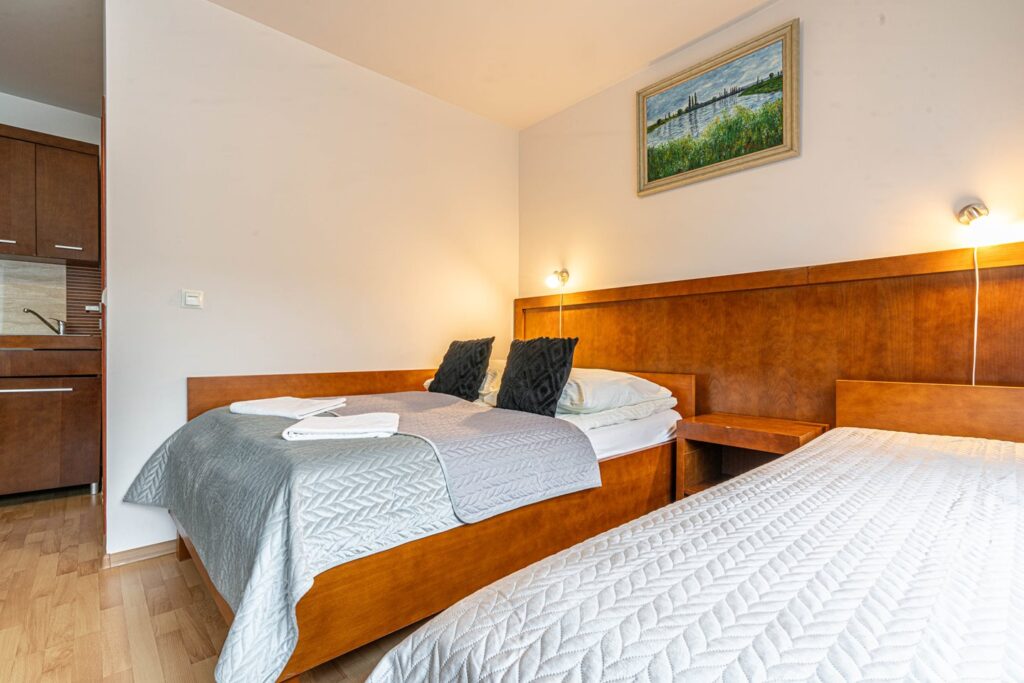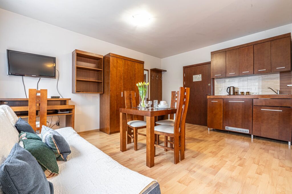ZarezerwujPrzytulny apartament, typu studio. Znajdziesz w nim: wyposażony aneks kuchenny (płyta grzewcza, lodówka, naczynia, garnki, sztućce oraz czajnik elektryczny), stół i krzesła dla 3 osób, TV z płaskim ekranem, kanapę, łóżko małżeńskie i dodatkowe łóżko pojedyncze. W łazience: prysznic, z deszczownicą, umywalka, WC i pachnące ręczniki.