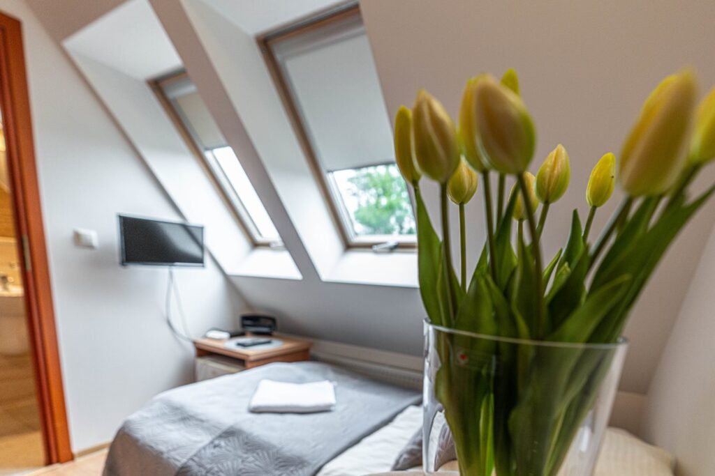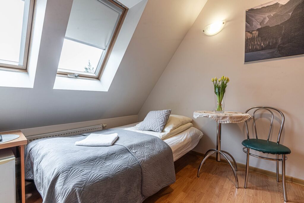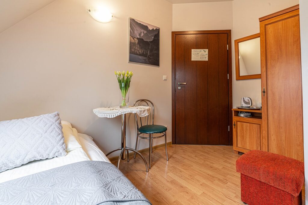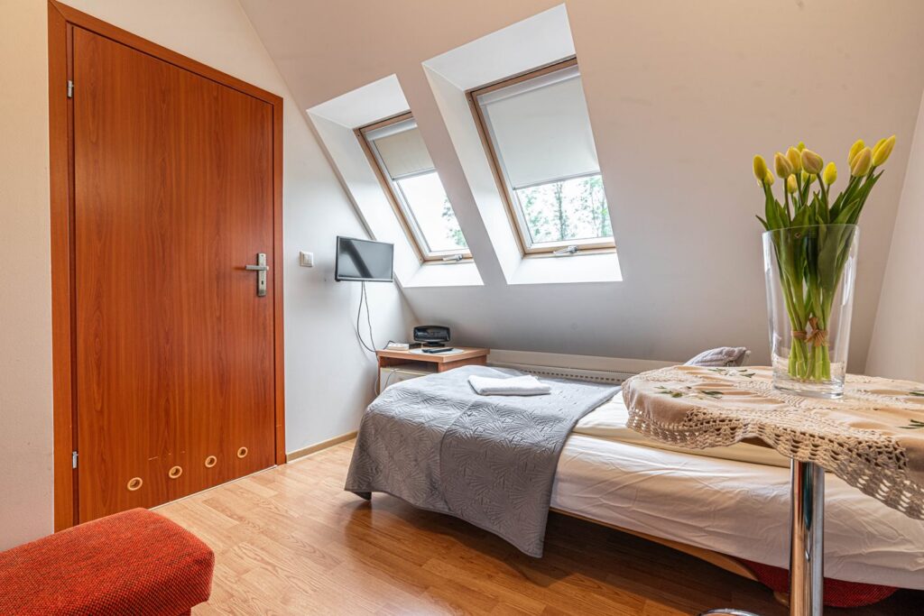 ZarezerwujWygodny pokój jednoosobowy. Znajdziesz w nim: łóżko pojedyncze, TV z płaskim ekranem, stolik, krzesło oraz lodówkę. W łazience: prysznic i pachnące ręczniki. Dodatkowo do dyspozycji gości wyposażony aneks kuchenny, położony na korytarzu.